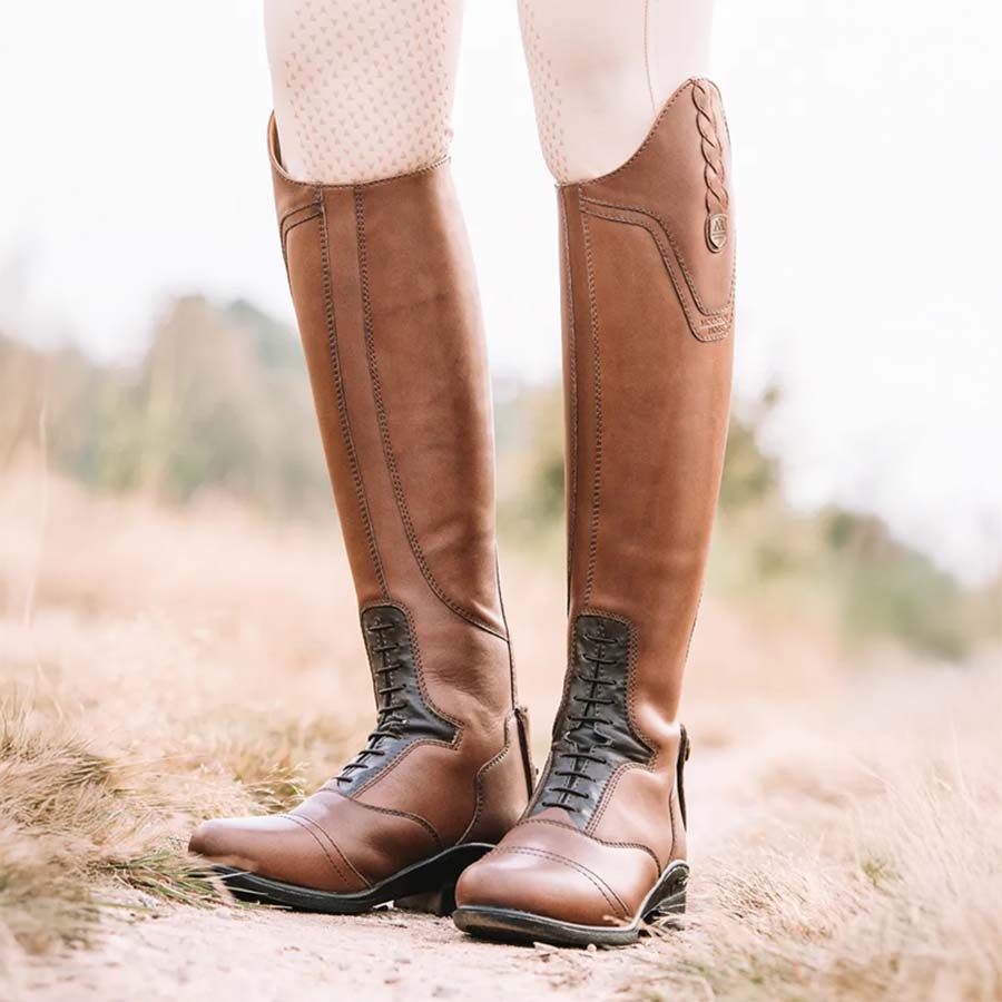 Kozaki jeździeckie Valkyria marki Mountain Horse wykonane są z miękkiej, brązowej skóry premium i wyposażone w system Vertycore Advanced Sole System, który zapewnia doskonałą amortyzację, przyczepność i stabilność. Model Valkyria posiada również elastyczne sznurowanie z przodu, ozdobne detale na górze cholewki oraz osłonę zamka i uchwyt na ostrogi z tyłu.