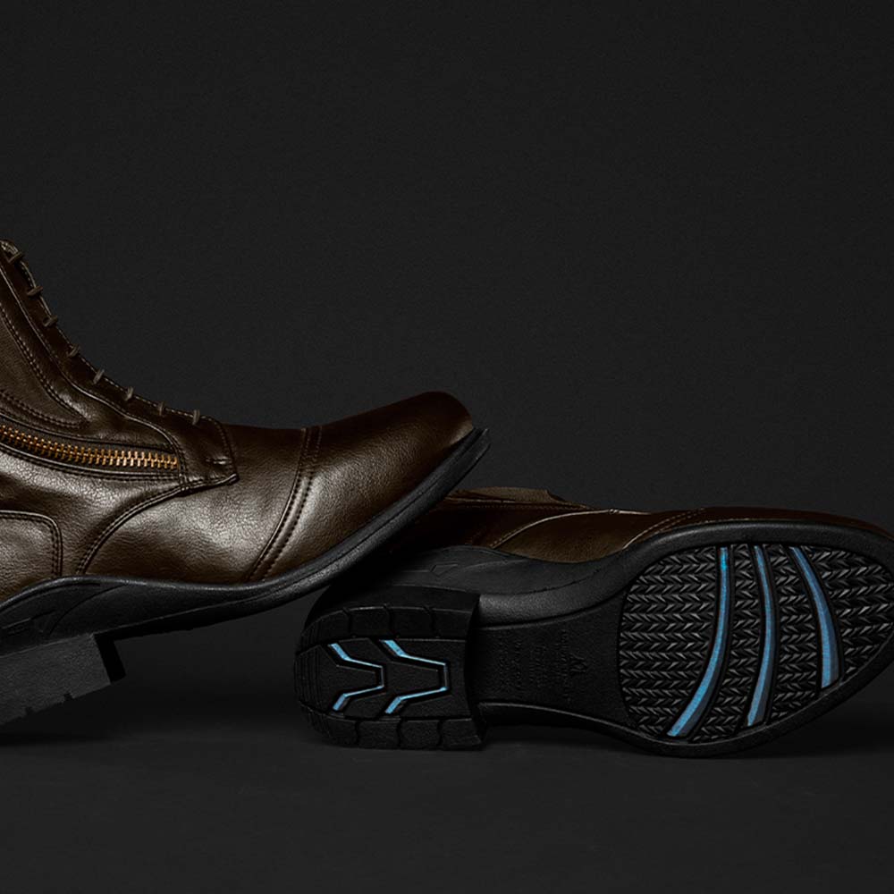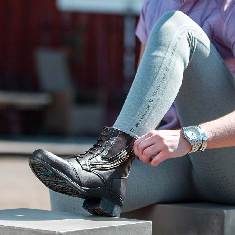 Zamek błyskawiczny w tych butach znajduje się po zewnętrznej stronie stopy, aby zmniejszyć ryzyko otarć o konia i sprzęt oraz ułatwić ich zakładanie i zdejmowanie.