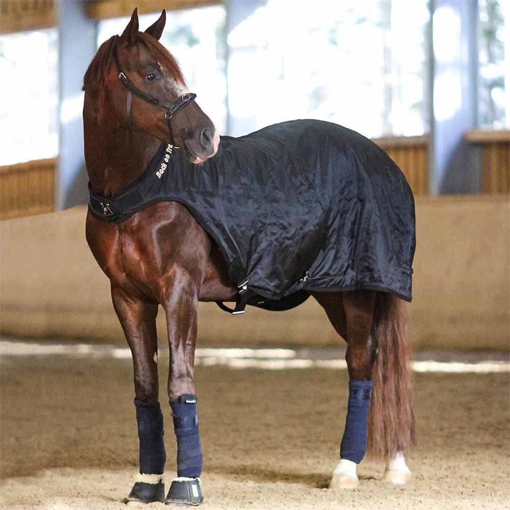 • Derka do ćwiczeń od Back On Track jest idealna, gdy na zewnątrz jest trochę chłodno. Chroni konia za pomocą materiału wodoodpornego, zapewniając jednocześnie pełną swobodę ruchu. Dzięki niezakłóconym ramionom, koń unika otarć podczas ruchu i aktywności. Wewnętrzna podszewka z technologią Welltex może również pomóc w rozluźnieniu mięśni i poprawie krążenia krwi.