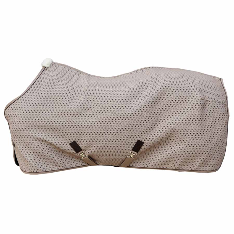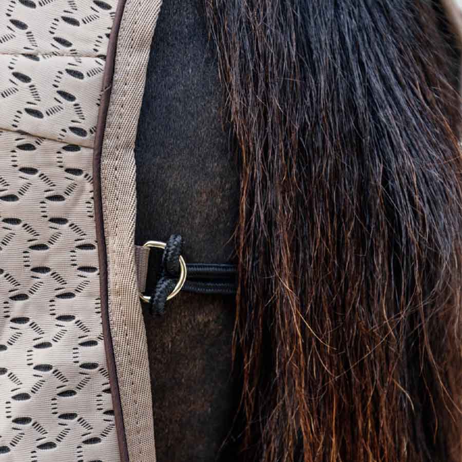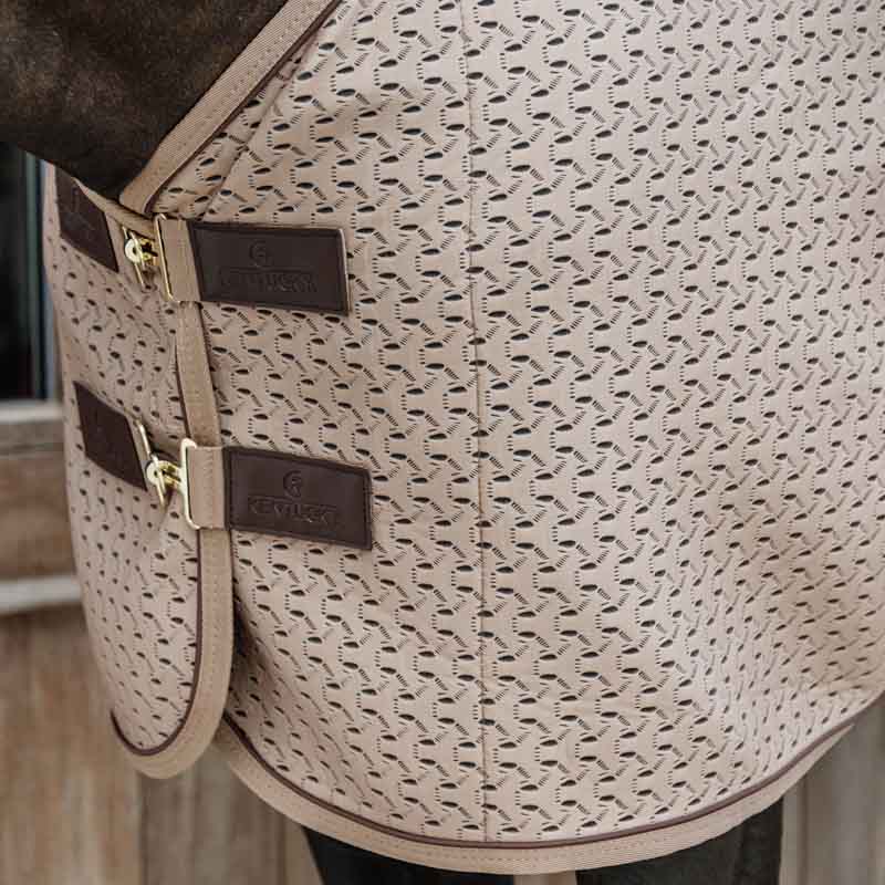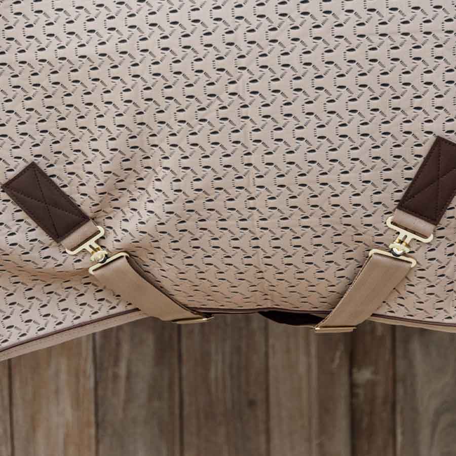 Beżowa derka 4D utrzymana w miejscu dzięki podwójnym zapięciom na klatce piersiowej, krzyżowym pasom oraz odczepianemu paskowi na ogon, jest również wyposażona w charakterystyczne detale z syntetycznej skóry oraz miękkie wypełnienie z sztucznego futra na kłębie.