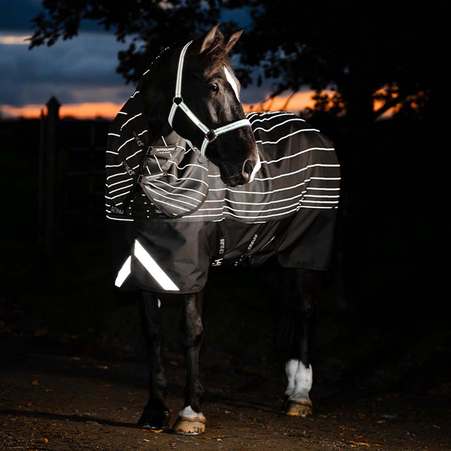 Derka padokowa Amigo FieldSafe Reflectech Plus 1200D 100g od Horseware została zaprojektowana z myślą o bezpieczeństwie i widoczności konia w każdych warunkach oświetleniowych. Wykonana z trwałego poliestru 1200D, derka jest wodoodporna i oddychająca, idealna do użytku na zewnątrz. Jej unikalną cechą jest odblaskowa przędza, która świeci w ciemności, ułatwiając dostrzeżenie konia. Derka posiada również odpinany kaptur i system bezpieczeństwa, który zrywa się w sytuacjach awaryjnych.
