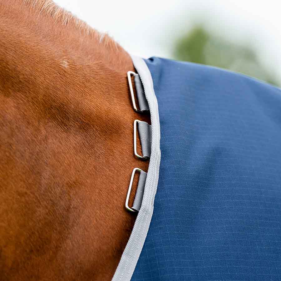 Model wyposażony jest w proste zapięcie z przodu oraz profilowane wycięcia przy nogach, które zwiększają swobodę ruchu. Stabilne dopasowanie zapewniają pasy krzyżowe pod brzuchem oraz zintegrowany pasek pod ogon z klapą na ogon. W zestawie znajduje się kaptur, a derka posiada również mocowania umożliwiające dopięcie podpinki ocieplającej, którą można dokupić osobno w celu zwiększenia izolacji w zimniejsze dni.