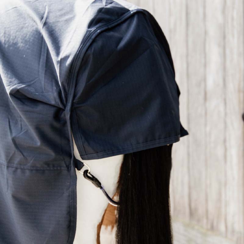 Derka posiada polarową podszewkę w części grzbietowej oraz na kapturze, która skutecznie pochłania wilgoć i pomaga osuszyć konia po wysiłku. Dzięki temu zapobiega wychłodzeniu, gdy koń jest jeszcze wilgotny po treningu lub deszczu. Zewnętrzny materiał wykonany jest z wytrzymałego poliestru 600D rip-stop z wodoodporną i odporną na zabrudzenia powłoką.