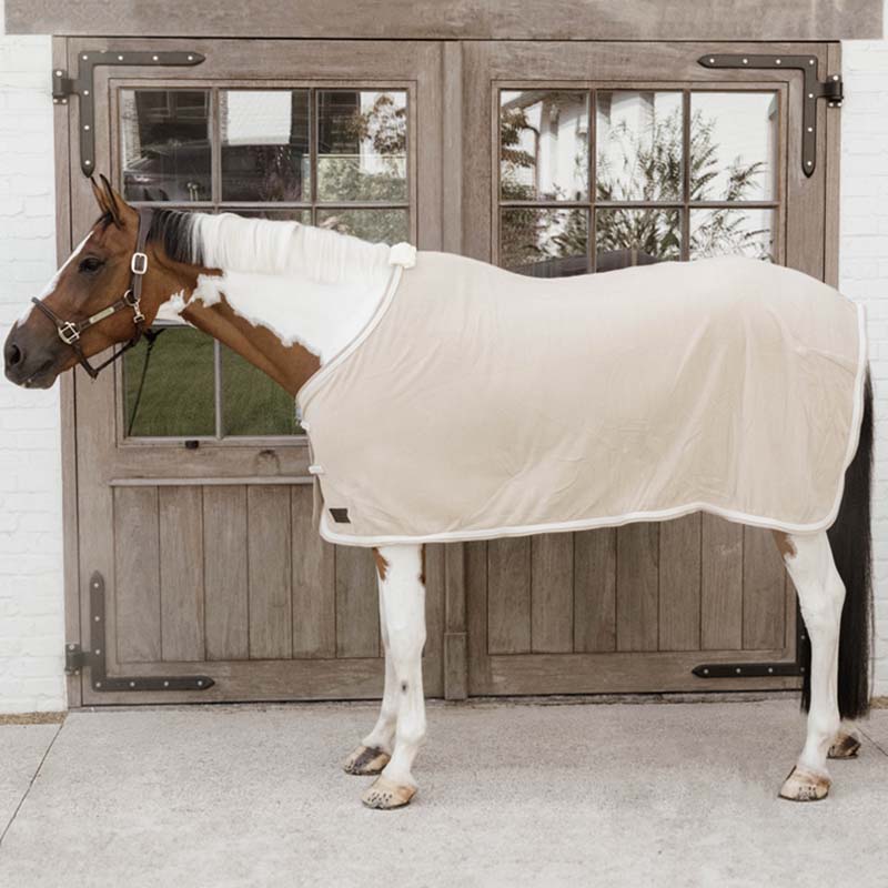 Derka wykonana jest z poliestru o strukturze przypominającej naturalną wełnę. Materiał jest lekki, dobrze oddycha i łatwo usunąć z niego trociny czy kurz. Anatomiczny krój zapewnia bardzo dobre dopasowanie do sylwetki konia, a miękka wyściółka z wegańskiego sztucznego futra przy kłębie zwiększa komfort i pomaga zapobiegać otarciom.