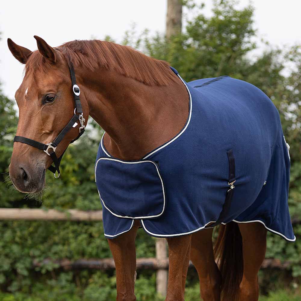 Miękka, luksusowa derka polarowa QHP, z ekskluzywnymi detalami zarówno z przodu, jak i z tyłu, idealna do używania podczas przenoszenia między stajnią a ujeżdżalnią, po sesjach jazdy, lub po prostu jako derka transportowa i konkursowa. Granatowa derka osuszająca jest na końcu zabezpieczona w miejscu za pomocą podwójnych zapięć na klatce piersiowej, dyskretnie ukrytych za elegancką płytką przednią, warkocza na ogon oraz odpinanych surcingli krzyżowych.