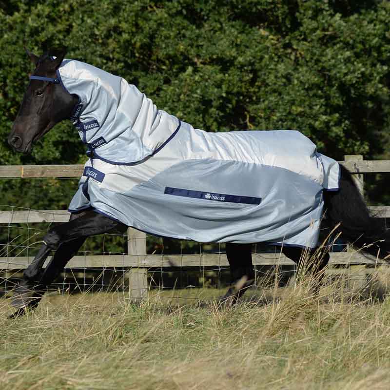 Derka zapewnia około 80% ochrony przed promieniowaniem UV, a srebrny kolor derki odbija promienie słoneczne, co pomaga utrzymać niższą temperaturę w upalne letnie dni. Posiada odpinany kołnierz do derki przymocowany klamrami z przodu, na derce, oraz paskiem na czole, aby zapewnić jego stabilność. Nawet elastyczna część brzucha, która pomaga utrzymać derkę na miejscu i zapewnia dodatkową ochronę, jest odpinana.