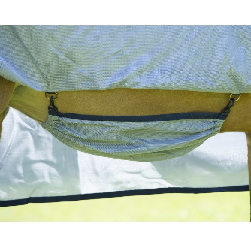 Bucas Buzz-Off to bestsellerowa derka przeciw owadom, wykonana z lekkiej, drobnej siatki, która zapewnia doskonałą cyrkulację powietrza. Skutecznie chroni konia przed muchami i innymi uciążliwymi owadami, a srebrny materiał dodatkowo odbija promienie słoneczne, pomagając utrzymać komfortową temperaturę w cieplejsze dni.