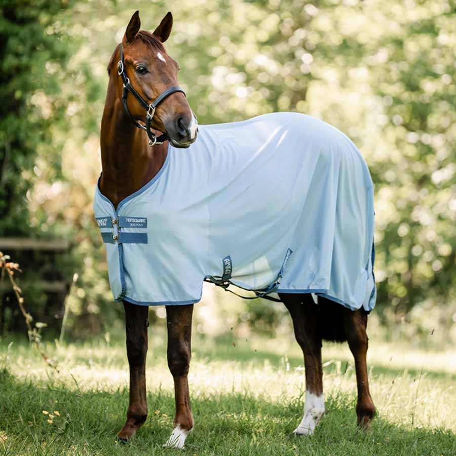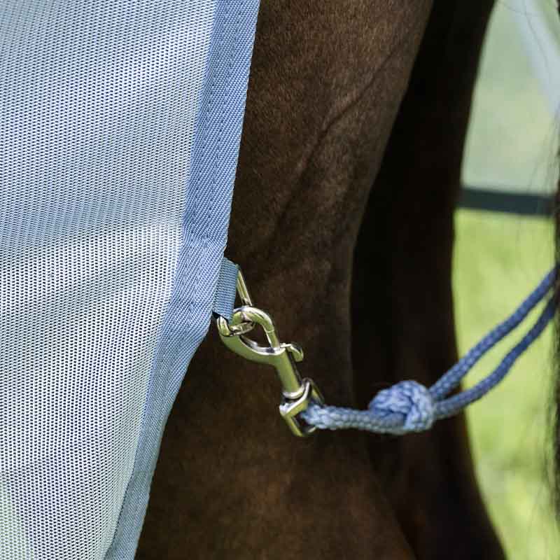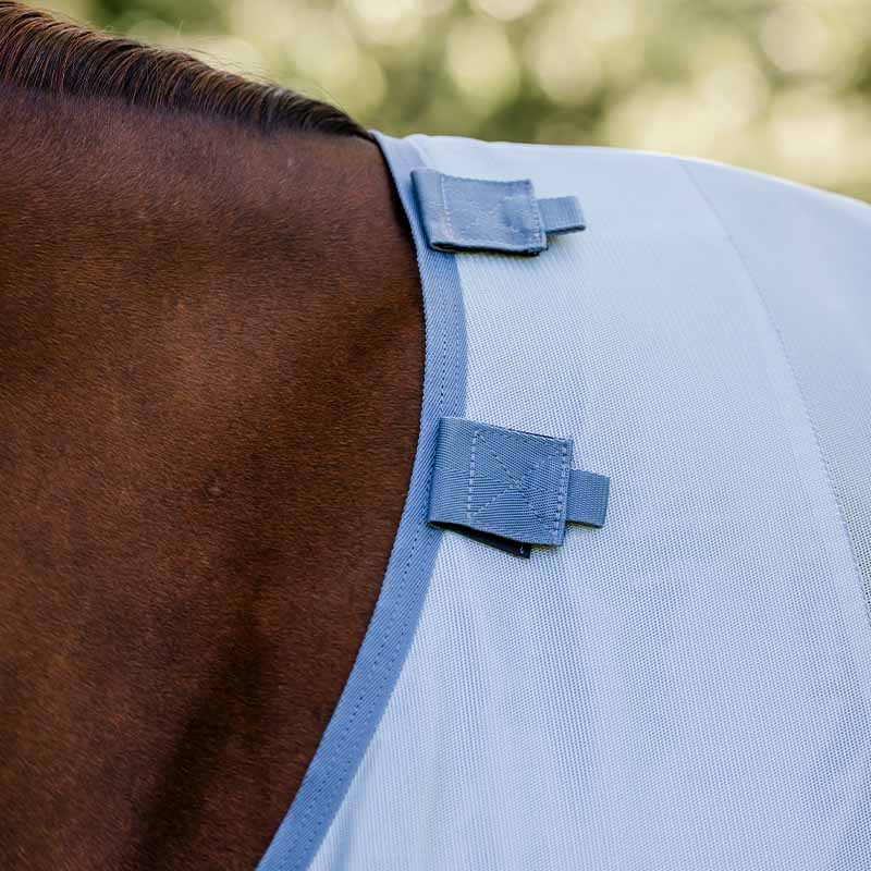 Wykonana z wytrzymałej, gęsto tkanej siatki poliestrowej, oferuje około 65% ochrony UV, jednocześnie umożliwiając swobodny przepływ powietrza. Duża klapa na ogon zwiększa zakres okrycia i dodatkowo chroni tylną część ciała konia.