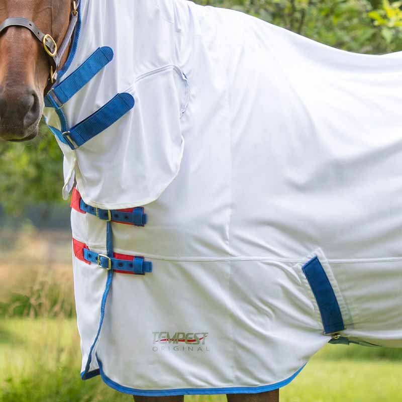 Materiał posiada właściwości odbijające promieniowanie UV, dzięki czemu chroni konia przed szkodliwym działaniem słońca – zewnętrzna warstwa zapewnia do 80% ochrony UV. Bezszwowa konstrukcja w okolicy szyi oraz podszycie w części łopatkowej pomagają ograniczyć ryzyko otarć.