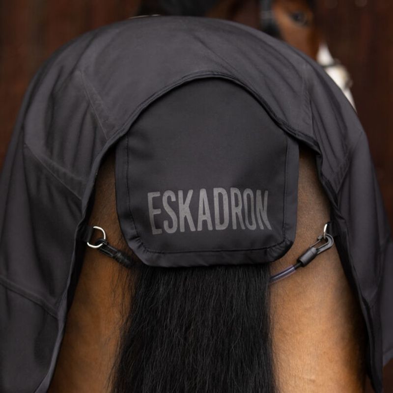 Derka do jazdy i lonżowania Eskadron w kolorze czarnym to wszechstronna derka 2-w-1 zaprojektowana zarówno do jazdy, jak i lonży. Wykonana z trwałej tkaniny oxford 840 D, posiada miękką podszewkę z polaru dla dodatkowego komfortu. Dzięki wygodnemu zamkowi błyskawicznemu można łatwo zmieniać funkcje. Derka jest bezpiecznie przymocowana do siodła lub pasa lonżującego za pomocą InnoStraps. Posiada słup wody WP/3.000mm/H2O i oddychalność 3000g/m2/24h, co czyni ją zarówno wodoodporną, jak i oddychającą. Duża klapa ogonowa i pasek ogonowy z tunelem PVC zapewniają dodatkową ochronę. Długość pleców wynosi 105 cm dla rozmiaru S/M i 120 cm dla rozmiaru L/XL.