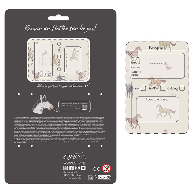 Ogłowie bezwędzidłowe do koników na patyku marki QHP. Wykonane z wytrzymałej skóry syntetycznej (PVC), z wodzami i ozdobnymi elementami z cynku. Idealne do codziennej zabawy i zawodów z konikami!