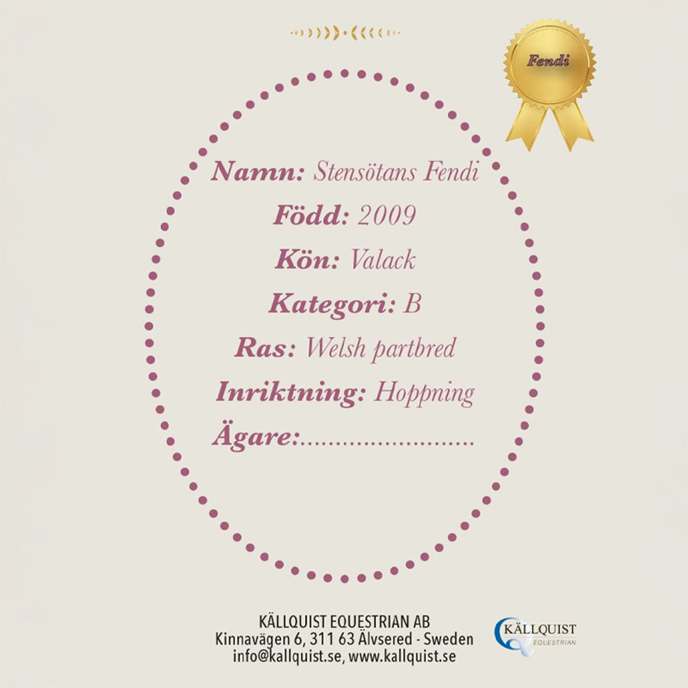 Fendi to hobbystyczny konik na kiju w maści izabelowatej z białą łysiną, oparty na rasie Welsh Partbred. Konik wykonany jest z poliestru, a grzywa i czułek z włóczki, którą można łatwo zaplatać. Kij wykonany jest z topoli – lekkiego drewna zapewniającego dobrą równowagę podczas zabawy.