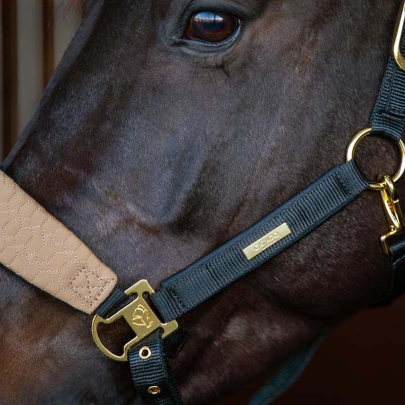 Kantar ma regulację po obu stronach potylicy oraz miękką wyściółkę z poliestru dla większego komfortu. Regulowany nachrapnik ma to samo miękkie wypełnienie. Luksusowe okucia z tłoczonym logo i metalowa plakietka z emblematem CATAGO dopełniają całość.