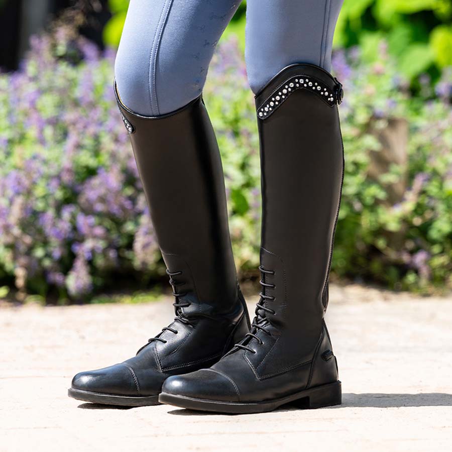 Z tyłu buty wyposażone są w zamek błyskawiczny oraz elastyczną wstawkę, która zapewnia optymalną elastyczność i dopasowanie. Z przodu znajduje się elastyczne sznurowanie, które zwiększa ruchomość wokół kostki. Buty jeździeckie mają także uchwyty na ostrogi po obu stronach.