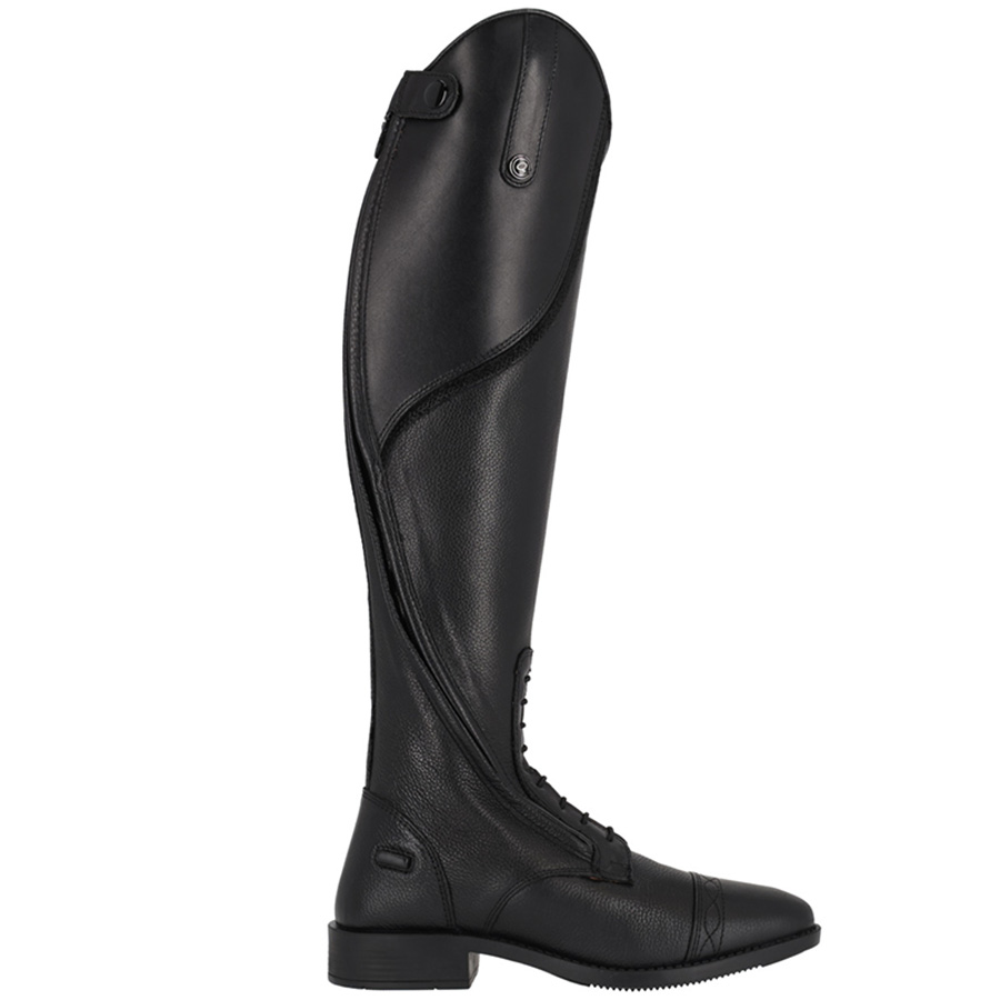 Ukierunkowany zamek błyskawiczny na zewnątrz zapobiega ocieraniu się butów o siodło i zwiększa ich trwałość z upływem czasu. Elastyczny panel na plecach dopasowuje się do kształtu nogi, a elastyczne sznurowanie z przodu zapewnia większą swobodę ruchów dla kostki.