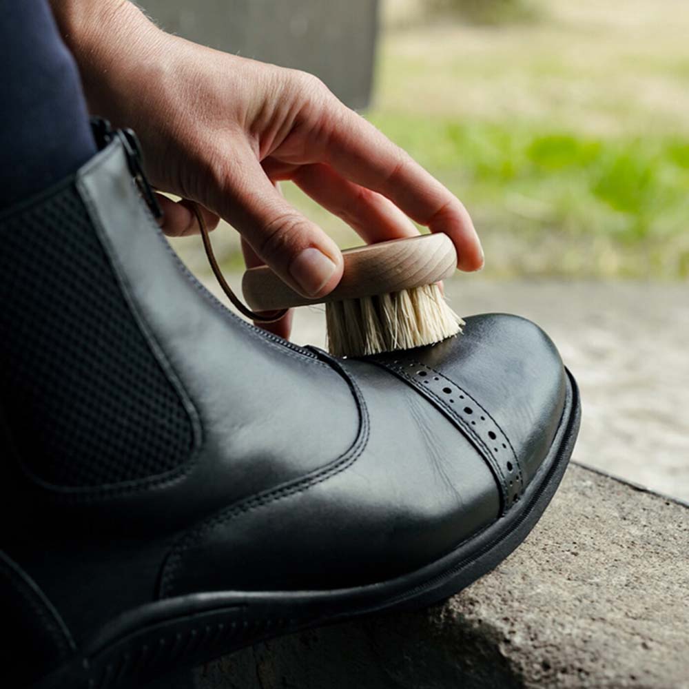 Szczotka do butów Mini marki Borstiq to poręczna mała szczotka z drewnianym grzbietem i dekoracyjnym skórzanym paskiem do łatwego zawieszania. Idealna do szybkiego usuwania piasku i brudu z butów, strzemion lub kopyt, co czyni ją niezbędnym narzędziem w zestawie do pielęgnacji lub torbie na zawody.