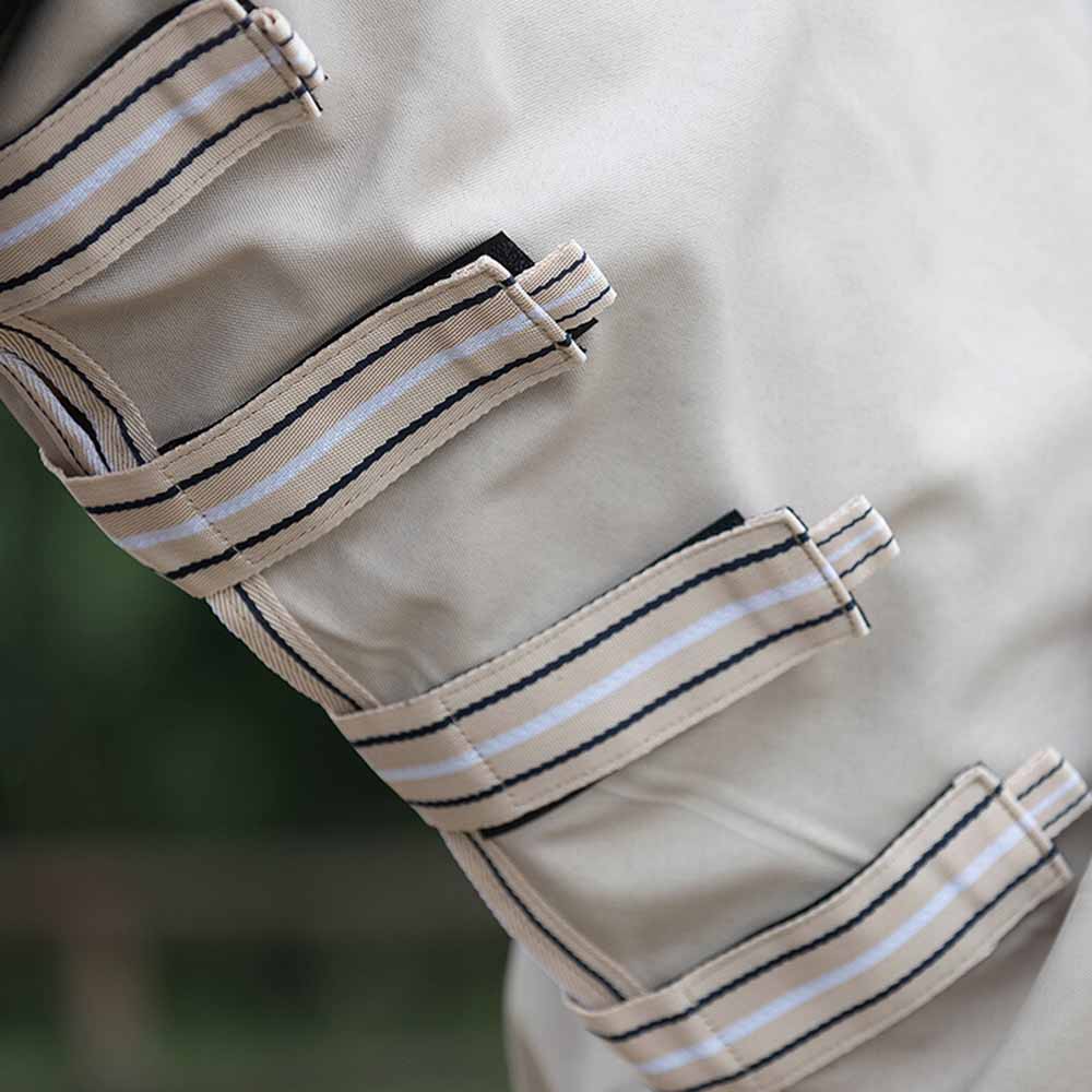 Model wyposażony jest w zabudowaną klapę na brzuch z trzema pasami, które stabilnie utrzymują derkę na miejscu. Zintegrowany kaptur sięga aż do głowy i posiada wycięcia na uszy, zapewniając dobre dopasowanie i pełne okrycie. Duża klapa na ogon, zamknięta po bokach, dodatkowo zwiększa poziom ochrony.