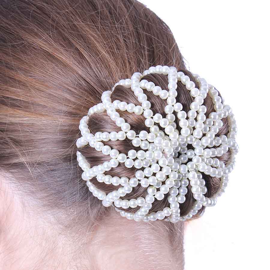 Stylowa, elastyczna siatka na włosy od QHP, która dzięki białym perłom nadaje Twojej fryzurze ekskluzywny i wyrafinowany wygląd.