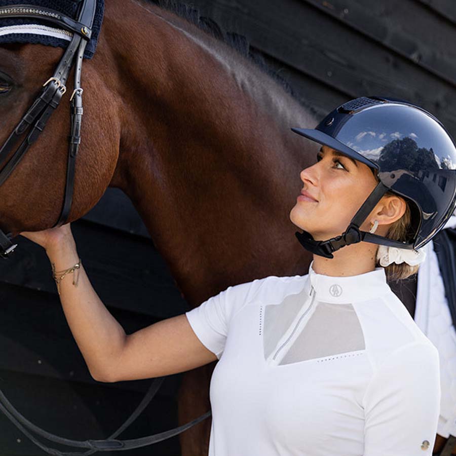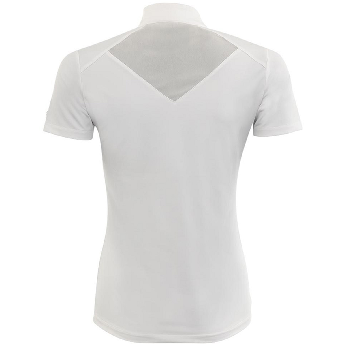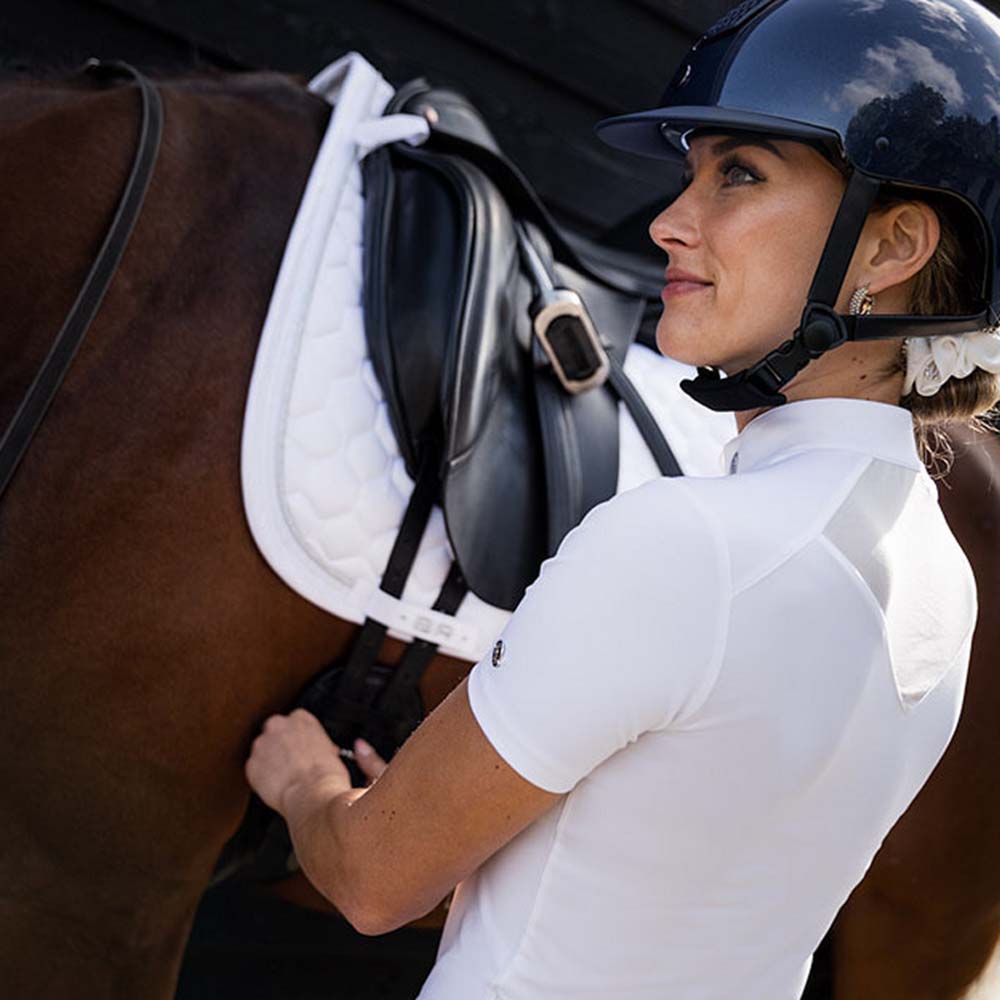 Top konkursowy Zapopan marki BR dla kobiet to elegancka i funkcjonalna koszulka konkursowa w kolorze białym. Posiada wysoki kołnierz z ochroną zamka i stylową wstawkę z siateczki dla dodatkowej wentylacji. Materiał jest regulujący wilgoć i szybko schnący, co zapewnia wysoki komfort noszenia. Elastyczna tkanina zapewnia ładne, dopasowane dopasowanie. Srebrny zamek błyskawiczny z przodu i imitacje diamentów dodają luksusowego wykończenia.