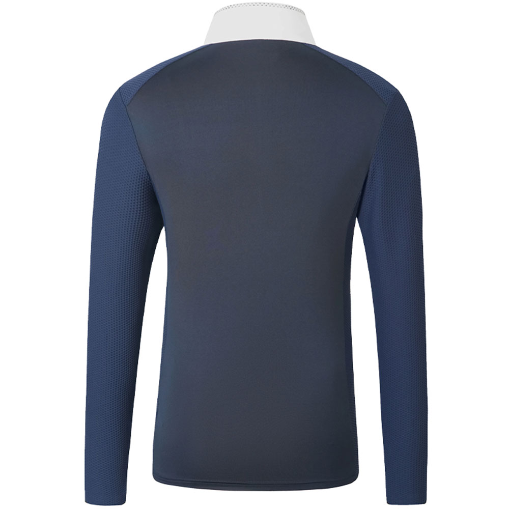 Granatowa, długorękawowa koszulka konkursowa Covalliero wykonana jest z lekkiego i funkcjonalnego materiału o dobrej oddychalności oraz właściwościach odprowadzania wilgoci, idealna na najbardziej intensywne dni zawodów.
