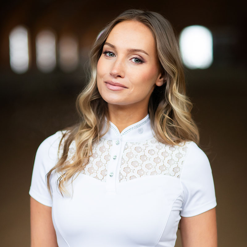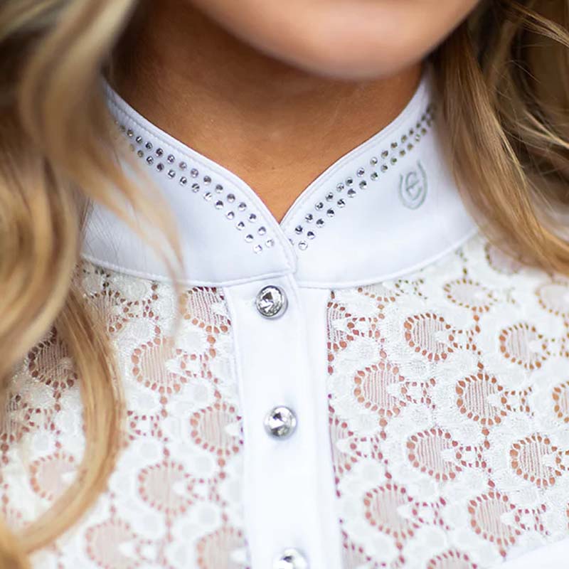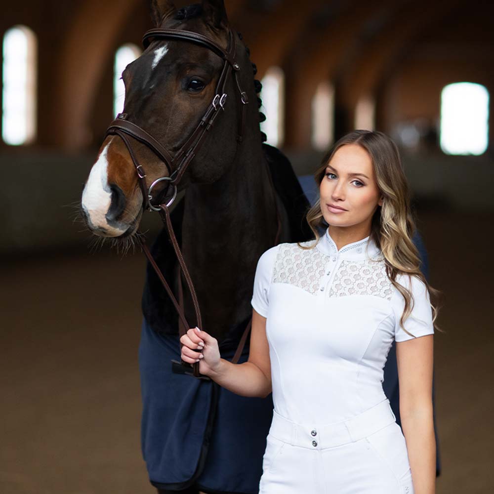 Elegancka koszulka konkursowa to doskonały wybór dla amazonek, które chcą wyróżnić się na czworoboku lub parkurze. Utrzymana w klasycznej bieli, zachwyca subtelnymi koronkowymi wstawkami z przodu i z tyłu, które nadają jej wyjątkowo kobiecego i wyrafinowanego charakteru.