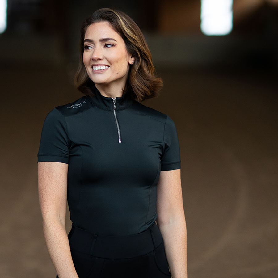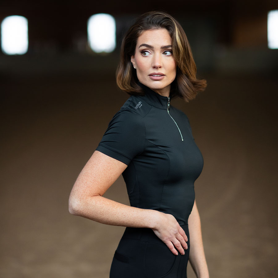 Ta treningowa koszulka jeździecka to idealny wybór dla jeźdźców, którzy szukają połączenia stylu i funkcjonalności. Elegancki, czarny design z srebrnym zamkiem z przodu nadaje jej nowoczesny i sportowy wygląd.