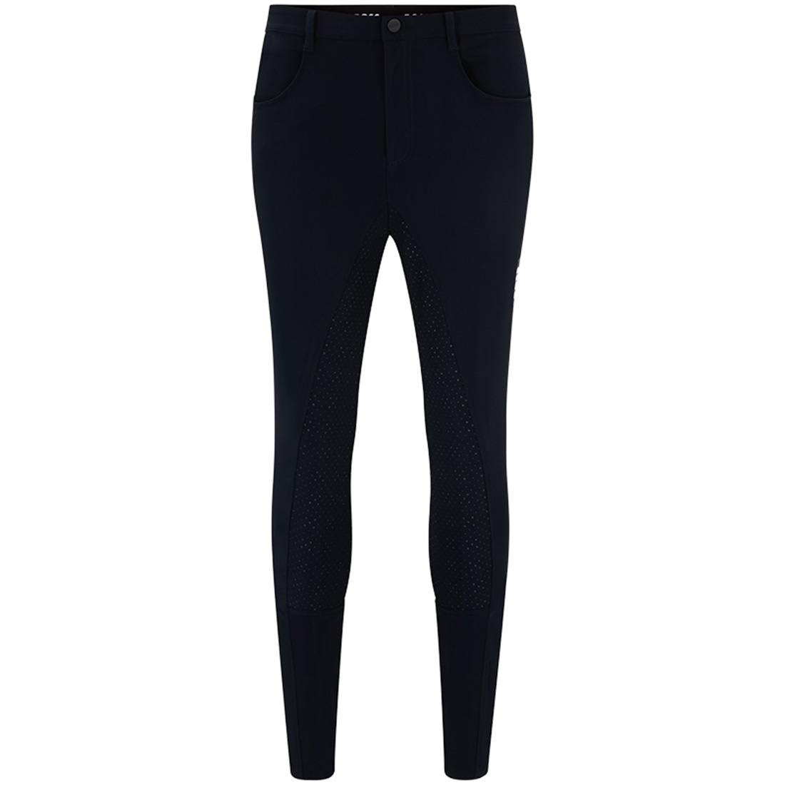 Bryczesy męskie BOSS Equestrian Jim Full Grip w kolorze czarnym zostały zaprojektowane z myślą o maksymalnym komforcie i swobodzie ruchów. Wykonane z oddychającego materiału Power Sport z 4-kierunkowym stretchem, te bryczesy mają dopasowany pas i zamek błyskawiczny dla pewnego dopasowania. Silikonowa naszywka z logo na lewym udzie i szlufka z tyłu z charakterystycznymi paskami BOSS dodają elegancji. Nogawki wykonane są z miękkiej dzianiny dla wygodnego dopasowania.