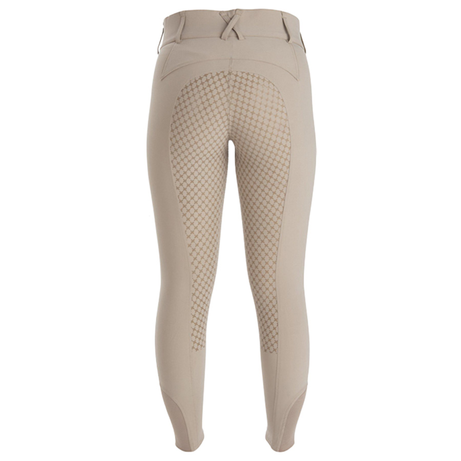 Model z wysokim stanem i szerokim pasem dobrze dopasowuje się do sylwetki, a zapięcie na trzy guziki z przodu gwarantuje stabilność. Pełny lej silikonowy zapewnia dobrą przyczepność w siodle, wspierając pewność dosiadu.