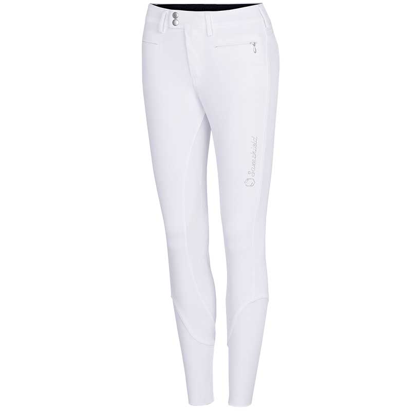 Bryczesy wyróżniają się licznymi dopracowanymi detalami – silikonowy pas zapobiega wysuwaniu się koszuli, a lej kolanowy poprawia przyczepność w siodle. Model wyposażony jest również w elementy z kryształków Swarovski®, w tym logo na udzie oraz efektowne tylne kieszenie wykonane z materiału Crystal Fabric Swarovski®, które nadają całości luksusowego charakteru.