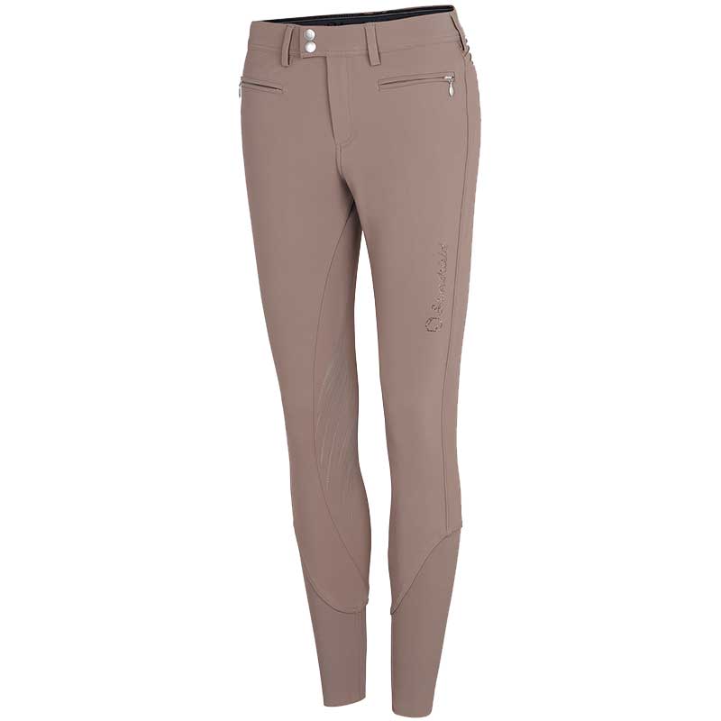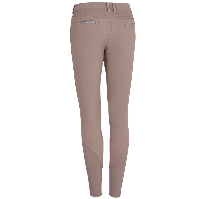 Bryczesy wyróżniają się licznymi dopracowanymi detalami – silikonowy pas zapobiega wysuwaniu się koszuli, a lej kolanowy poprawia przyczepność w siodle. Model wyposażony jest również w elementy z kryształków Swarovski®, w tym logo na udzie oraz efektowne tylne kieszenie wykonane z materiału Crystal Fabric Swarovski®, które nadają całości luksusowego charakteru.