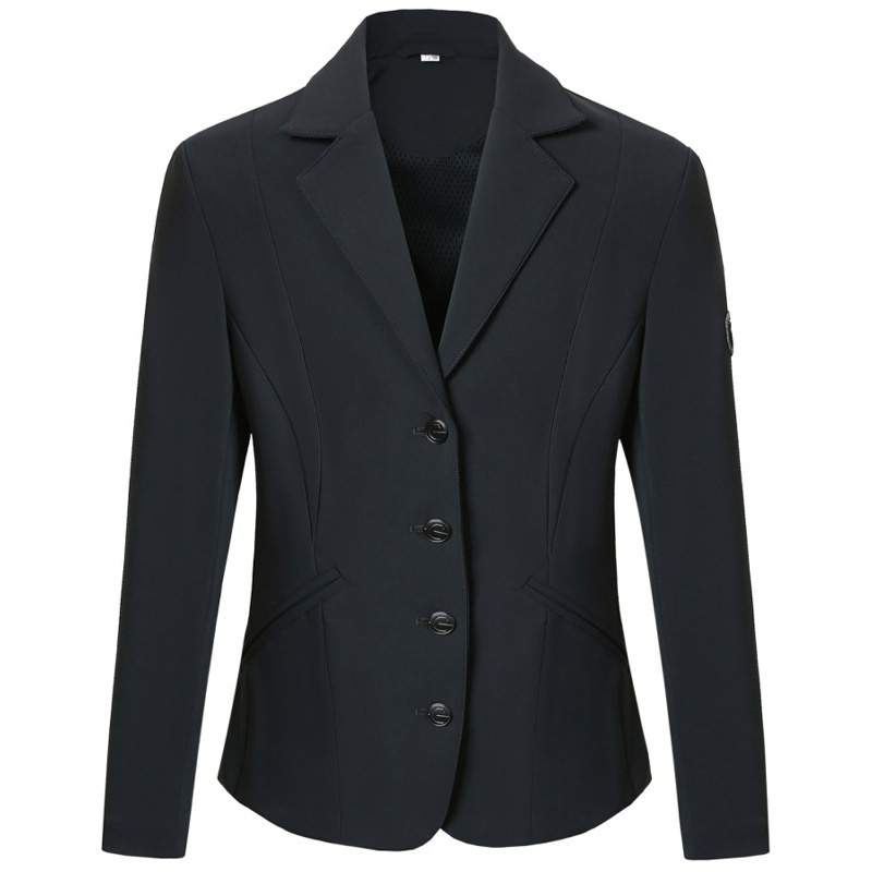Wykonany z elastycznego i oddychającego materiału, doskonale dopasowuje się do sylwetki i zapewnia swobodę ruchów w siodle. Frak zapinany jest na cztery guziki z ukrytym zamkiem błyskawicznym, co nadaje mu schludny, profesjonalny wygląd.