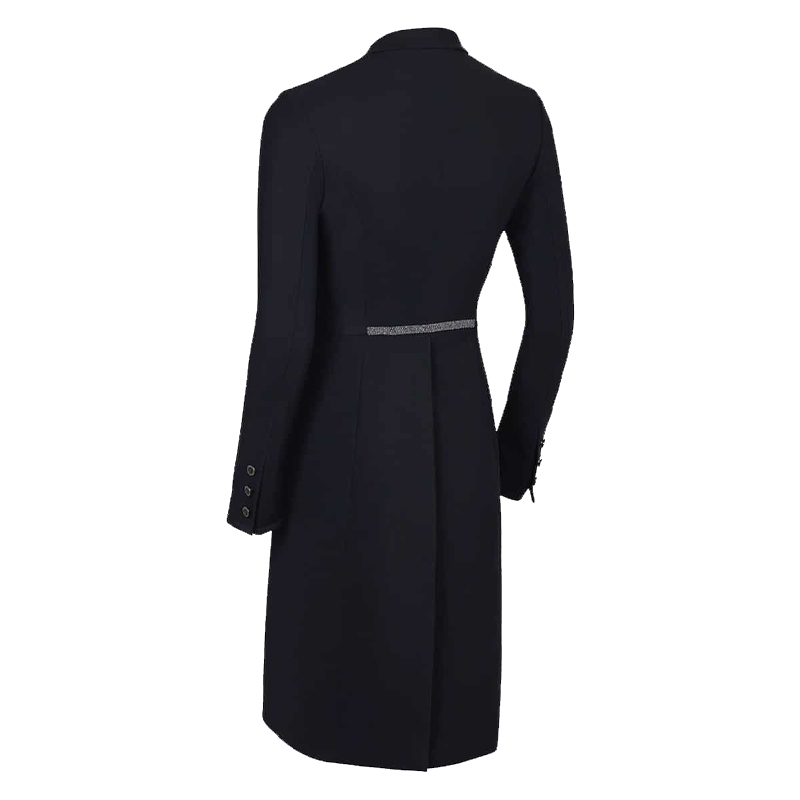 Ekskluzywny frak ujeżdżeniowy wykonany z elastycznego, trwałego materiału technicznego o wysokiej oddychalności i niewielkiej wadze. Klasyczny design został podkreślony eleganckimi detalami z kryształków Swarovski®, umieszczonymi na kołnierzu, w talii z tyłu oraz przy linii wycięcia z przodu.