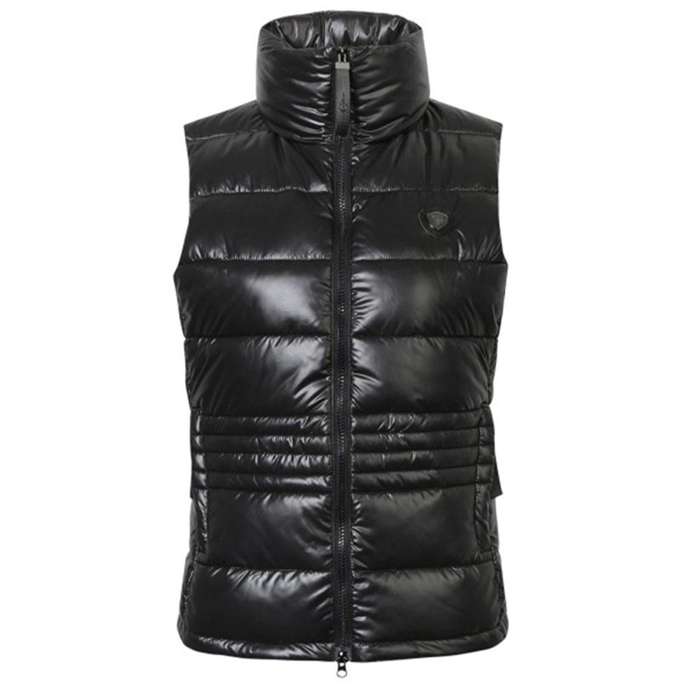 Ciepło wyściełana, wodoodporna kamizelka jeździecka od Covalliero - wykonana z czarnego materiału o stylowej, połyskującej powierzchni, zaprojektowana z wysokim kołnierzem oraz dopasowanym, smukłym krojem. Dodatkowo, kamizelka została wyposażona w dwie kieszenie zapinane na zamek oraz praktyczny zamek błyskawiczny dwukierunkowy z przodu.