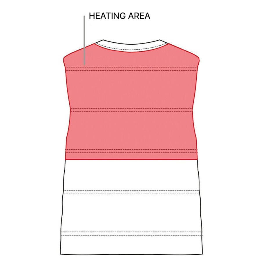Elementy grzewcze rozmieszczone są na plecach – od górnej części aż po talię – dla równomiernej i skutecznej dystrybucji ciepła. Dopasowany krój dodatkowo pomaga w utrzymaniu ciepła. Kamizelka posiada praktyczny dwukierunkowy zamek z przodu, dwie zewnętrzne kieszenie na zamek oraz odpinany kaptur chroniący przed wiatrem i chłodem.