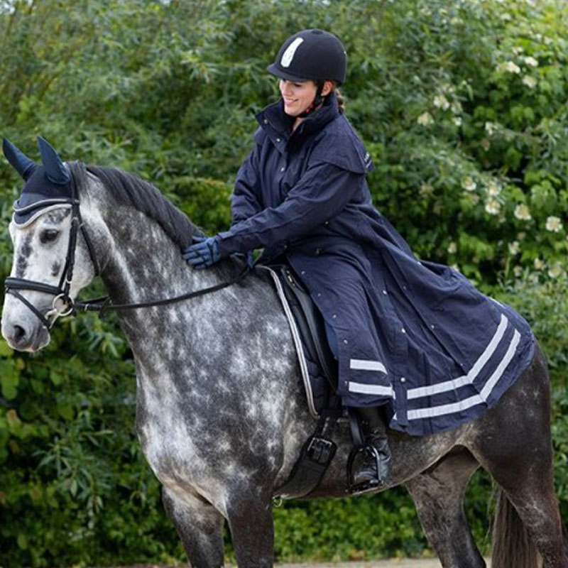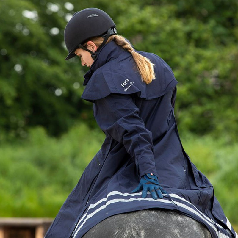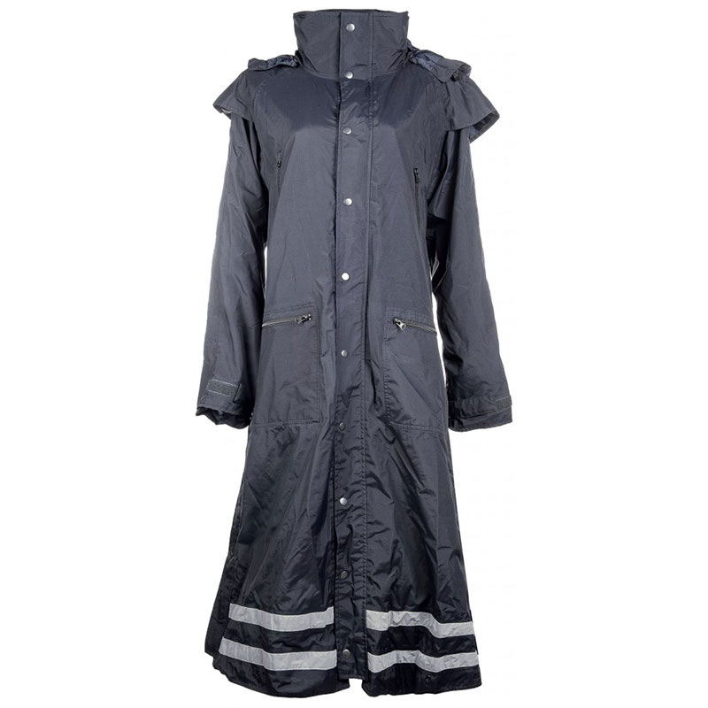 Praktyczny płaszcz przeciwdeszczowy o wysoce funkcjonalnym designie. Oprócz tego, że jest wiatro- i wodoodporny, płaszcz ma doskonałą oddychalność, co czyni go wygodnym i odpowiednim do użycia nawet w cieplejszych porach roku. Płaszcz wyposażony jest w wygodne paski na nogi, które łatwo zapina się wokół ud, aby zapewnić jego stabilność podczas całej jazdy. Posiada rozcięcie na jazdę oraz zamek błyskawiczny dwukierunkowy, co przyczynia się do zwiększonej mobilności w siodle. Rękawy płaszcza mają zapięcia na rzep, aby zablokować zarówno wiatr, jak i wodę.