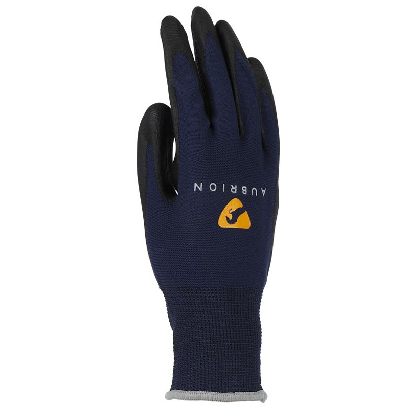 Trwałe, granatowe rękawice stajenne Aubrion zapewniają doskonałą dodatkową ochronę podczas pracy w stajni lub w ogrodzie. Projekt obejmuje znaczne sekcje antypoślizgowe na dłoniach, co zapewnia, że te rękawice stajenne zawsze oferują najlepszą możliwą przyczepność, nawet gdy są mokre.