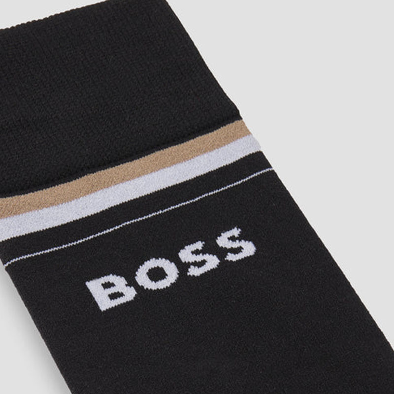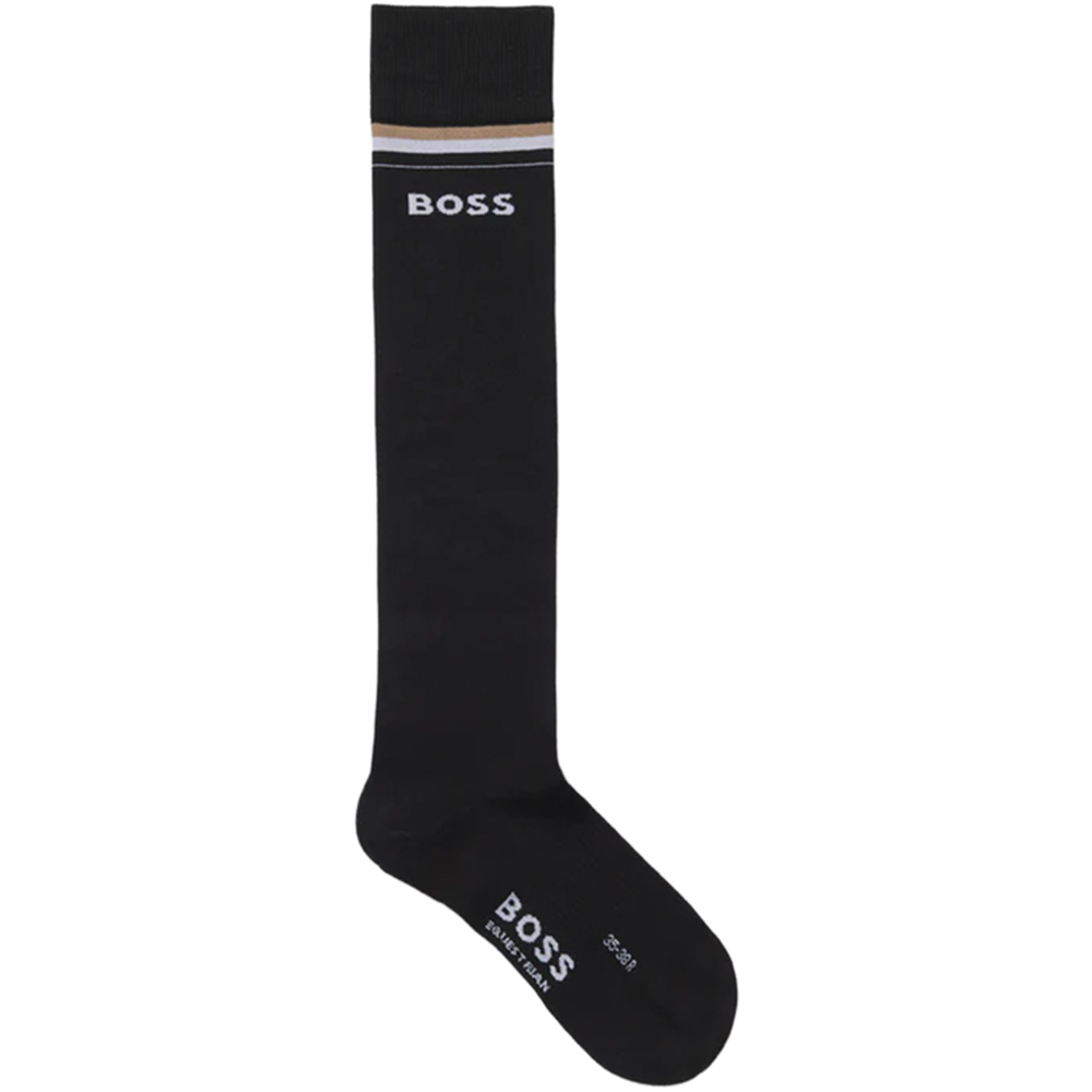 Skarpety jeździeckie BOSS Equestrian Classic zostały zaprojektowane z myślą o komforcie i funkcjonalności podczas jazdy. Te unisex czarne skarpety są formowane na palcach i pięcie dla optymalnego dopasowania i posiadają antypoślizgową ochronę w środkowej części stopy dla dodatkowego bezpieczeństwa. Miękka skarpeta ma ciasne dopasowanie na nodze, co czyni ją cienką i wygodną w butach. Wpleciony pasek z podpisem i logo BOSS zdobią skarpetę pod prążkowanym brzegiem.