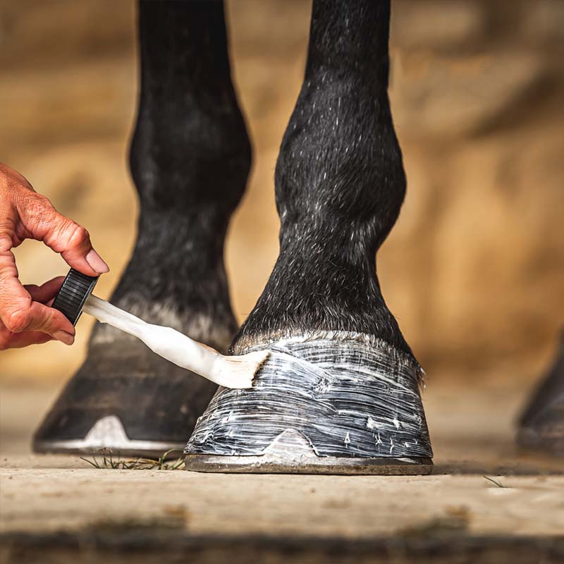 Upewnij się, że kopyto jest czyste i suche, wolne od tłuszczów i olejów. Nałóż obficie na całe kopyto przy użyciu dołączonego pędzelka, powtarzaj codziennie.