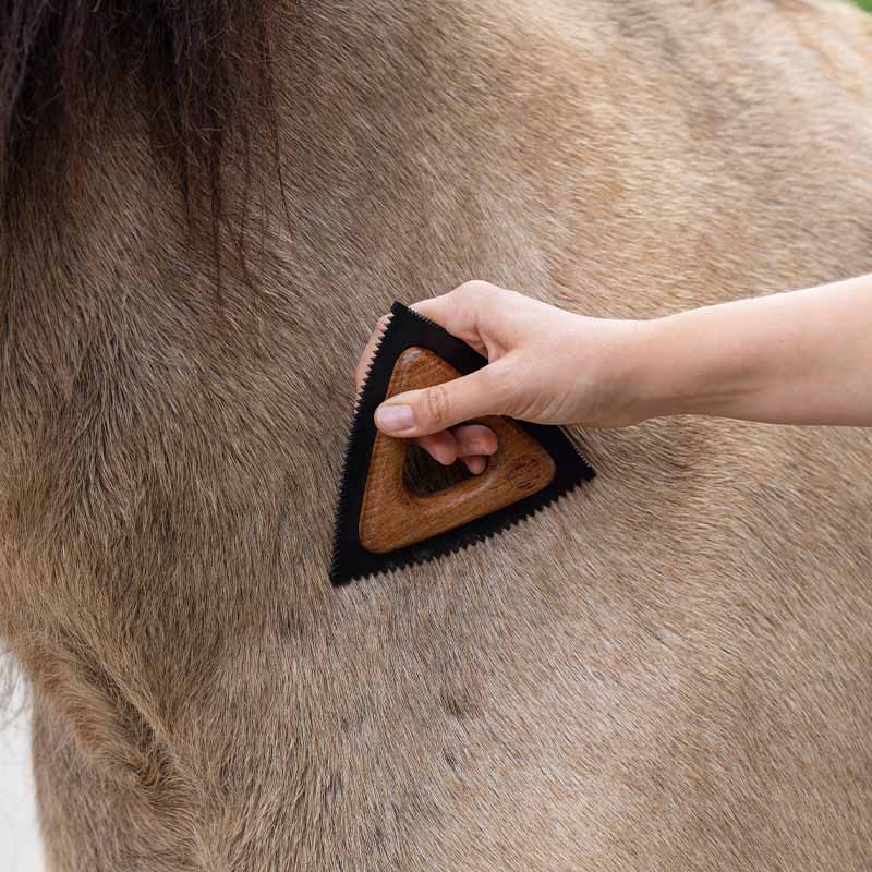 Skrobak ma trzy strony o różnej gęstości gumowych zębów, co pozwala łatwo dopasować go do konia i potrzeb. Usuwa także brud i ślady potu oraz może wspierać krążenie krwi.