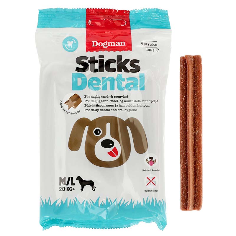 Sticks Dental Medium/Large, od Dogman, to rodzaj miękkiej kości do żucia, która pomaga zarówno w usuwaniu płytki nazębnej, jak i ograniczaniu powstawania kamienia nazębnego.