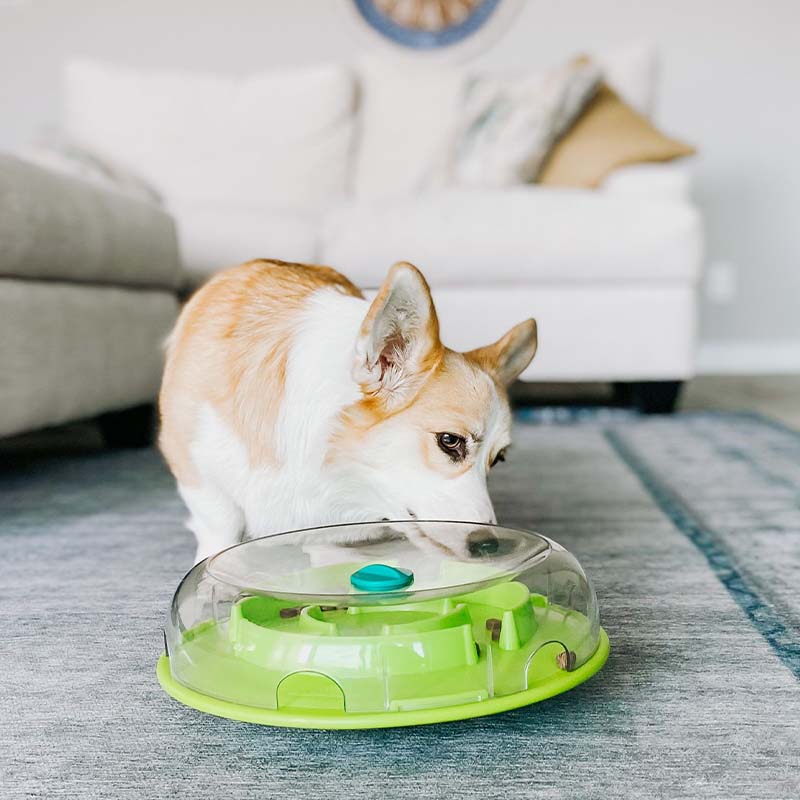 Przezroczysta przykrywka zapewnia, że przysmaki są zawsze widoczne, co motywuje psa do dalszej pracy po jedzenie.