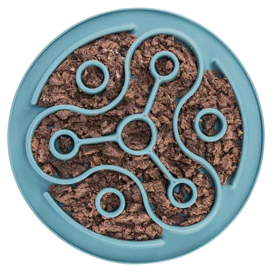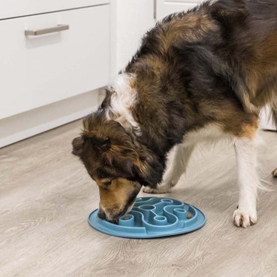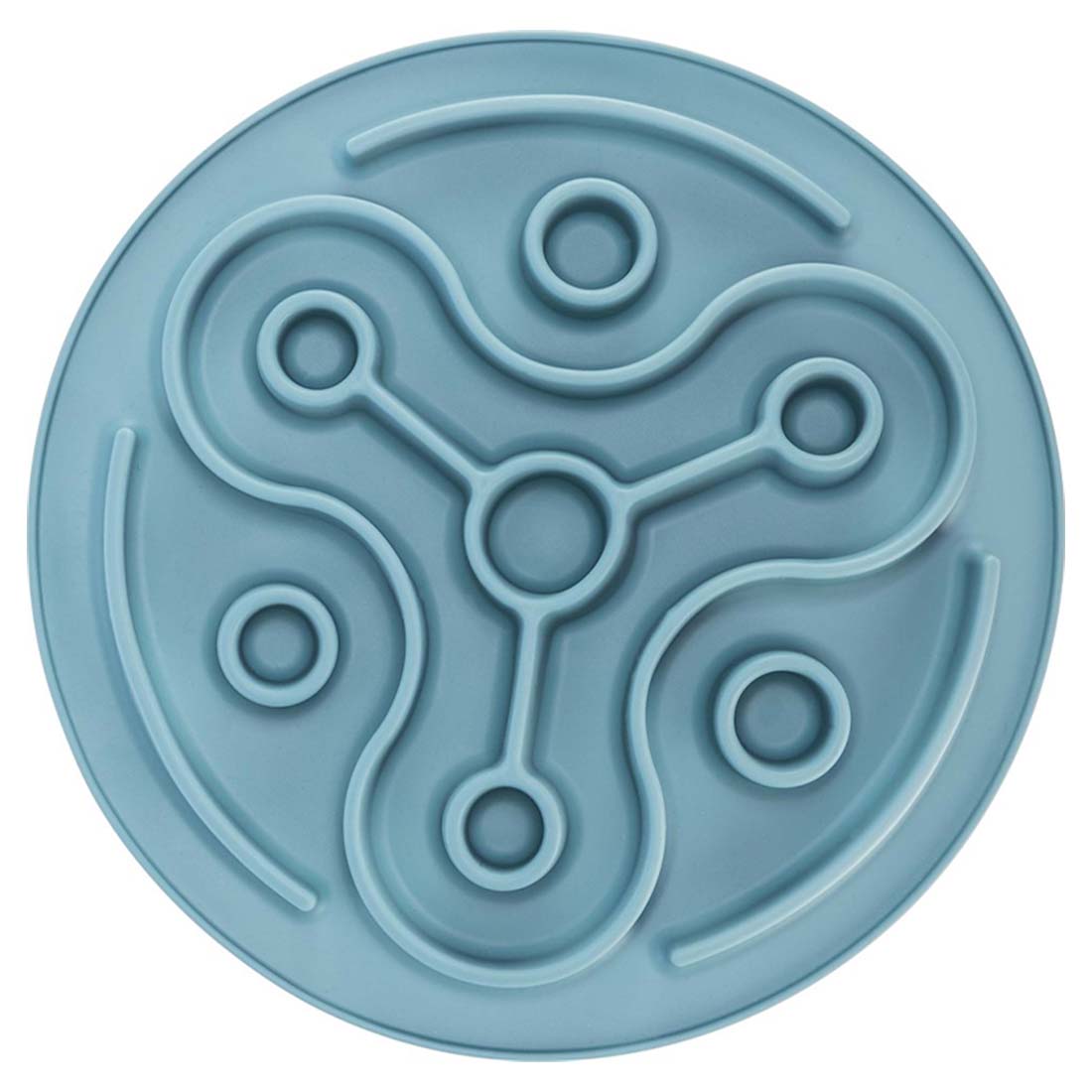 Turkusowa, okrągła mata Slow Feed działa ze wszystkimi rodzajami jedzenia, a jeśli chcesz zająć swojego psa na dłużej, możesz włożyć ją do zamrażarki na chwilę po napełnieniu jedzeniem.