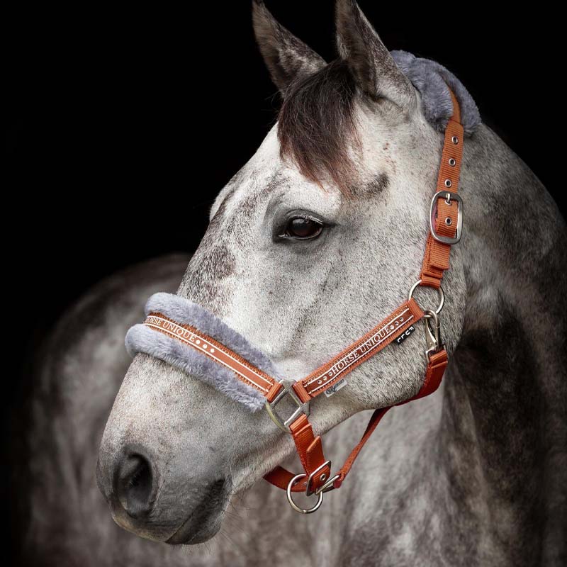 Kantar z Futerkiem od Horse Unique wykonany jest z trwałego polipropylenu i posiada miękkie futerko na nosie i szyi dla dodatkowego komfortu. Jest ozdobiony kamieniami na paskach policzkowych i nachrapniku, co dodaje stylowego akcentu. Pasek potyliczny i nachrapnik są regulowane za pomocą matowych srebrnych klamer, co ułatwia dopasowanie do konia.