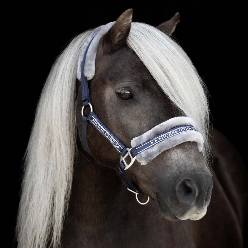 Kantar z Futerkiem od Horse Unique wykonany jest z trwałego polipropylenu i posiada miękkie futerko na nosie i szyi dla dodatkowego komfortu. Granatowo/szary design jest elegancki i stylowy, z dekoracyjnymi kamieniami na paskach policzkowych i nosie. Regulowane paski potyliczny i nachrapnik z matowymi srebrnymi klamrami zapewniają idealne dopasowanie dla Twojego konia.