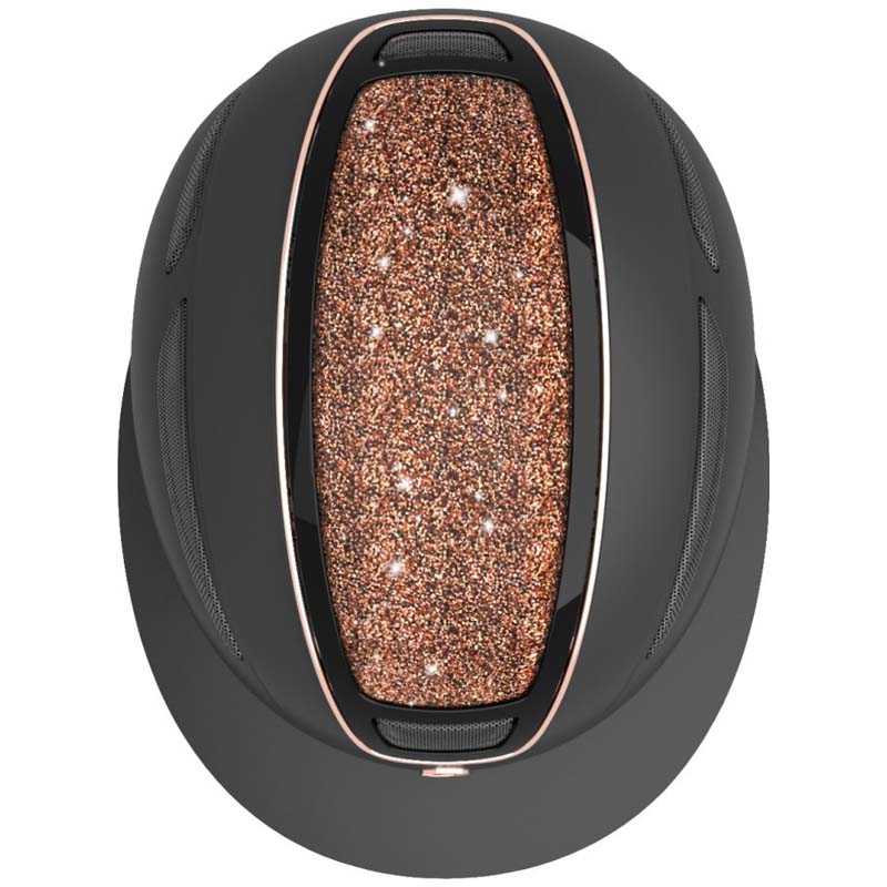 Kask wyróżnia się brokatowym wykończeniem górnej części oraz subtelnymi detalami w kolorze różowego złota, które nadają elegancki, ale nienachalny charakter. Miękkie paski obszyte skórą syntetyczną zapewniają wygodę i estetyczne wykończenie.