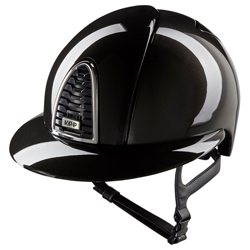 • Czarna, wysokopołyskowa wersja kasku KEP Cromo 2.0 Shine Polo z polerowanym wykończeniem i szerokim daszkiem to model, który – jak wszystkie kaski KEP – wyróżnia się wyjątkowo niską wagą oraz doskonałą wentylacją. Kask został wyposażony w charakterystyczny dla marki pasek podbródkowy wykonany z naturalnej skóry, z 5-punktowym systemem mocowania, który zapobiega przesuwaniu się kasku i zapewnia jego prawidłowe ułożenie na głowie. Dzięki temu ochrona obejmuje całą głowę – od czubka aż po kark.