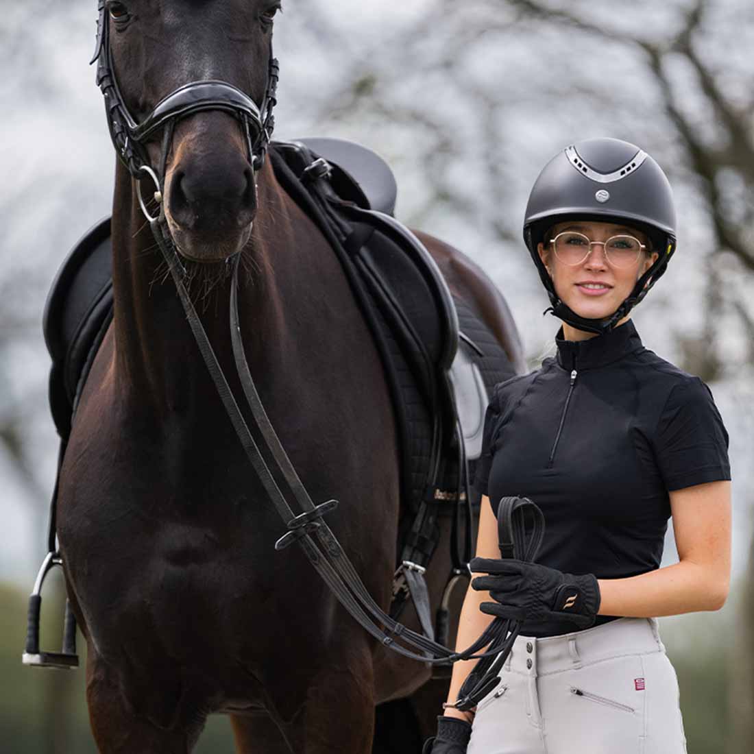 Back on Track EQ3 Pardus+ Smooth Top z regulacją pokrętłem to elegancki, czarny kask jeździecki o matowym wykończeniu. Otwory wentylacyjne nie tylko zapewniają bardzo dobrą cyrkulację powietrza, ale stanowią również estetyczny element designu.