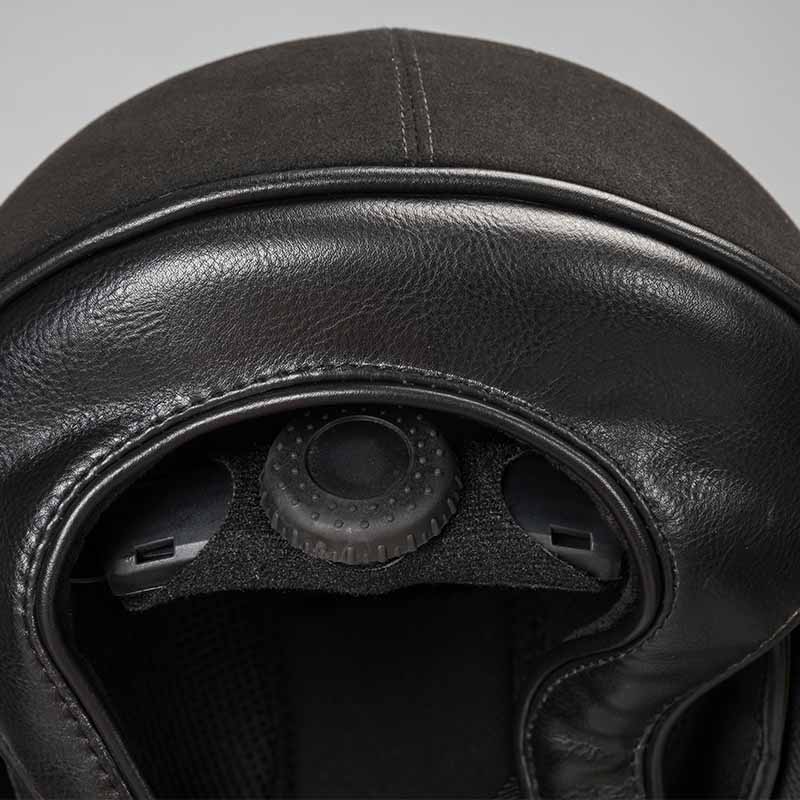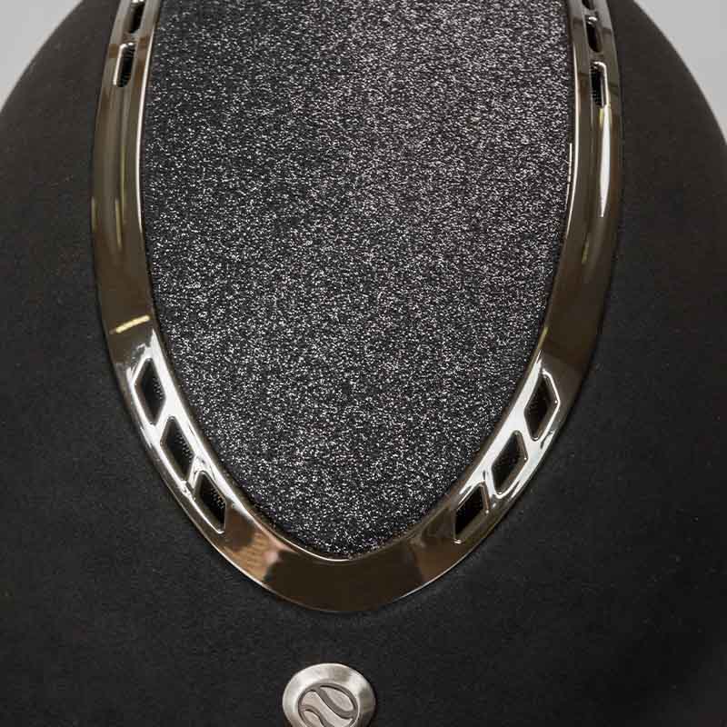 Back on Track EQ3 Pardus+ z pokrętłem Microfiber Glitter to elegancki, czarny kask jeździecki z powierzchnią z mikrofibry oraz efektownym, brokatowym panelem górnym. Otwory wentylacyjne nie tylko zapewniają bardzo dobrą cyrkulację powietrza, ale stanowią również estetyczny element wykończenia.