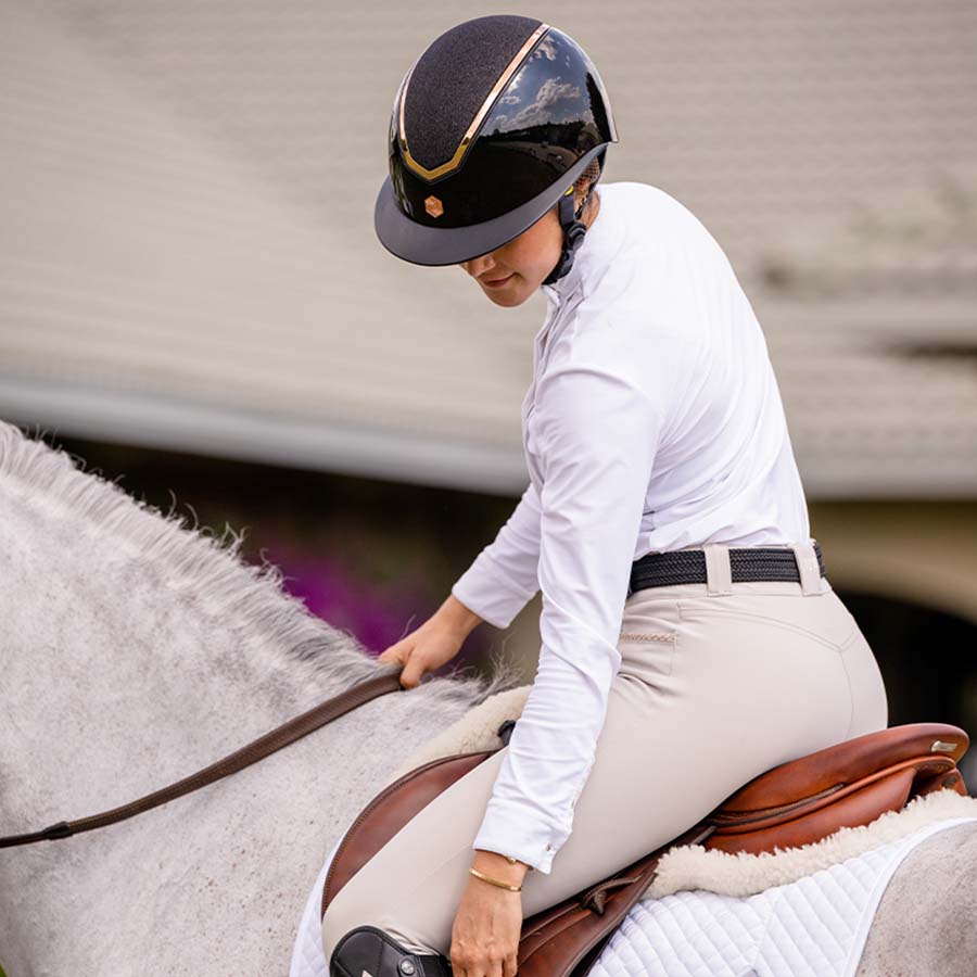Charles Owen produkuje swoje kaski jeździeckie ręcznie, przykładając dużą wagę do każdego etapu produkcji – zarówno pod względem komfortu i designu, jak i jakości oraz bezpieczeństwa. Model Kylo z szerokim daszkiem typu polo, wysokopołyskowym wykończeniem, brokatowymi elementami oraz detalami w kolorze różowego złota jest tego doskonałym przykładem.