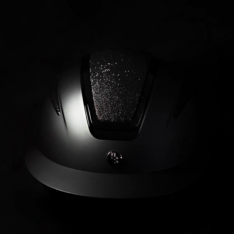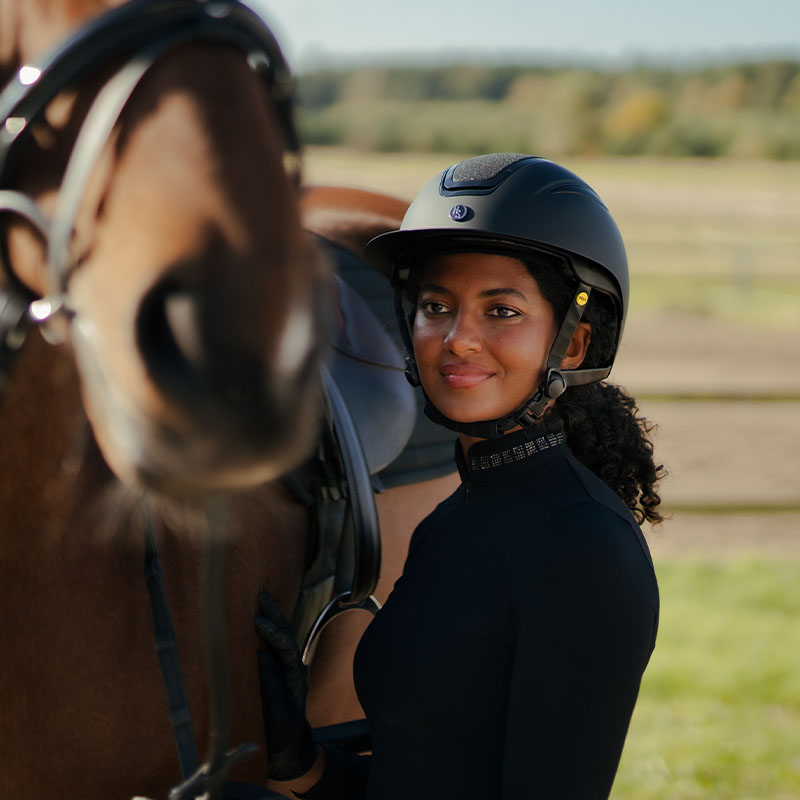 HS Mips Air Matte od Hansbo Sport to kask jeździecki, który w praktyczny sposób łączy funkcjonalność ze stonowanym, nowoczesnym wyglądem. Matowa, czarna powierzchnia w połączeniu z szerokim daszkiem typu polo nadaje mu elegancki charakter, a subtelne zdobienia z brokatem i chromowanymi ramkami delikatnie podkreślają całość.